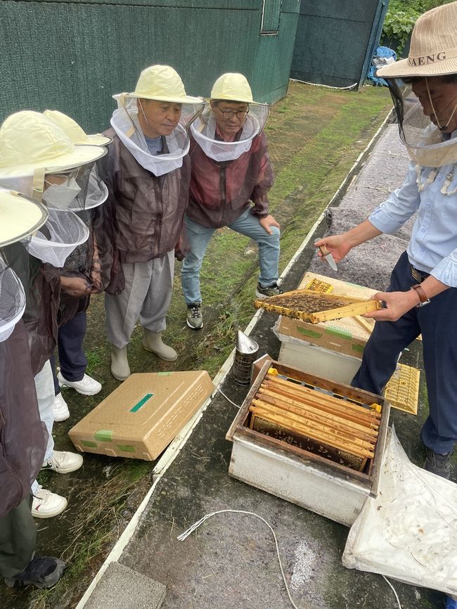 양봉교육 수강생들이 보호 장비를 착용하고 벌통을 관찰하며 양봉을 체험하고 있다.