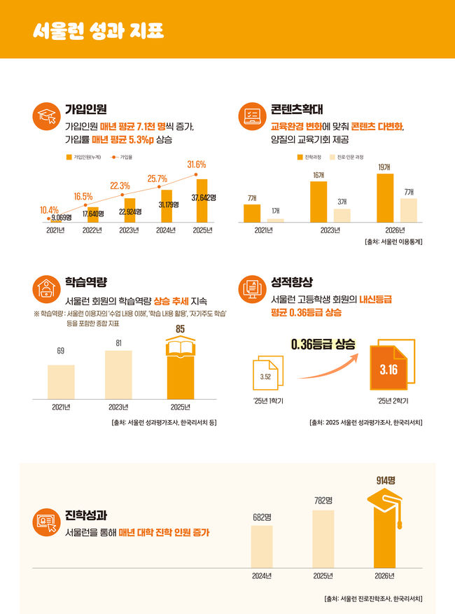 정진우 서울시 평생교육국장은 “서울런이 대학 합격 증가, 사교육비 절감, 학습역량 향상, 취업 확대 등 전반적인 성과를 입증하고 있다”며 “앞으로 AI 역량 강화와 진로·취업 지원을 통해 학습 전 과정을 책임지는 종합 플랫폼으로 발전시키겠다”고 말했다.