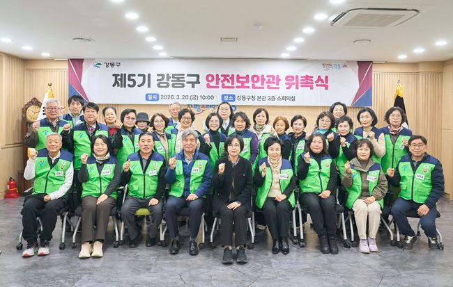 강동구 제5기 안전보안관 위촉식 사진.강동구(구청장 이수희)는 지난 20일 제5기 안전보안관 위촉식을 열고 대표·부대표·권역별 팀장 등 임원진을 선출했다고 23일 밝혓다. 이 자리에서는 위촉장 수여와 함께 향후 활동 방향과 운영 계획도 공유됐다. 안전보안관은 생활 주변의 위험요인을 발굴하고 신고하는 민간 안전 활동 조직으로, 이번에 구성된 5기는 총 45명 규모다.