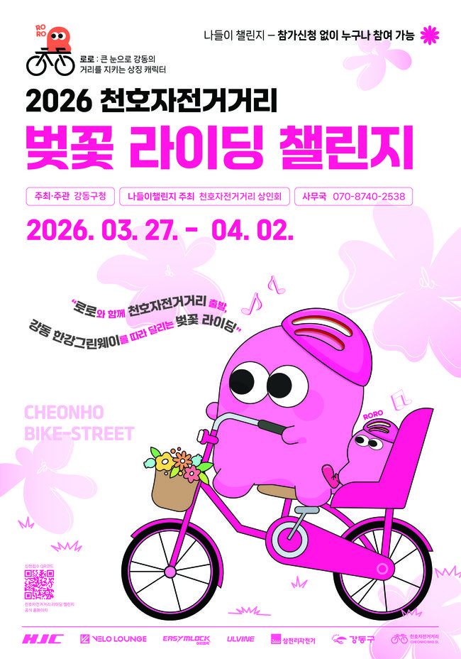 강동구(구청장 이수희)는 `2026 천호자전거거리 벚꽃 라이딩 챌린지`를 개최한다고 23일 밝혔다. 기간은 오는 27일부터 4월 2일까지 7일간이다. 천호자전거거리 상인회가 지역 상권과 연계한 나들이 코스를 마련해 봄맞이 지역 축제로 꾸며진다. 사전 신청 접수는 지난 2월 19일 시작 6시간 만에 2,500명이 몰리며 마감됐다.