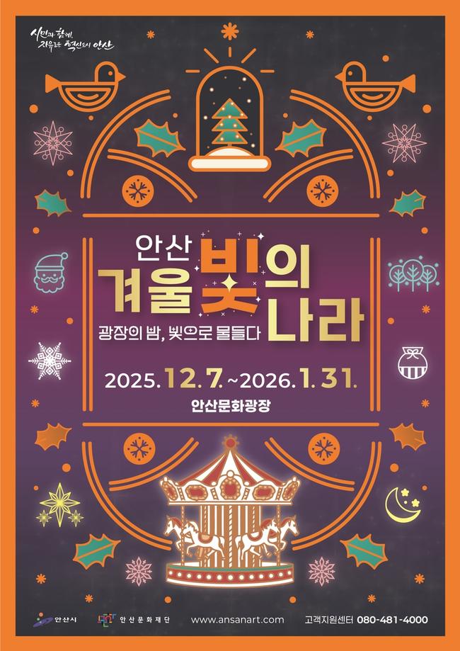 안산시(시장 이민근)는 주말인 오는 7일을 시작으로 내년도 1월 31일까지 두 달여 간 고잔동 안산문화광장 일대에서 겨울 야간 축제, `2025 안산 겨울 빛의 나라`를 개최한다고 1일 밝혔다.
