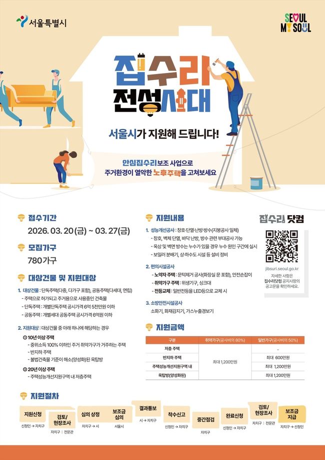 지원 대상은 서울시 전역의 10년 이상 된 단독주택(다중·다가구)과 공동주택(다세대·연립주택)이다. 단독주택은 공시가격 6억5000만 원 이하, 공동주택은 6억 원 이하가 기준이며 돌봄 통합지원 대상자와 주거 취약가구를 우선 지원한다.